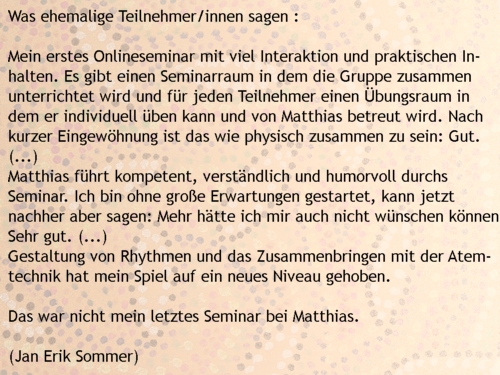 Auf diesem Online-Kurs können Sie an 5 Abenden reichlich Erfahrung und Wissen mit den verschiedensten Ansätzen und Aspekten des Spiels tanken und genug Input mitnehmen - Ihr Spiel wird danach einen mächtigen Schritt weiterkommen. Spaß am Rhythmus steht auf dem Programm, alles wird praktisch an Ihrem Instrument geübt.